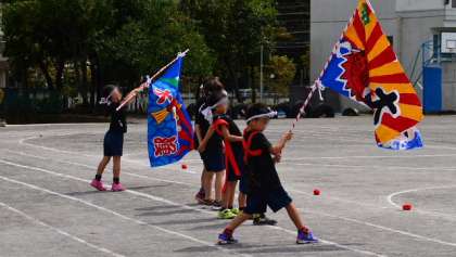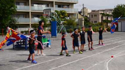 1・2年の練習では大漁旗がデビューです。赤いたすきと豆絞りの手ぬぐいでりりしい姿で踊ります。