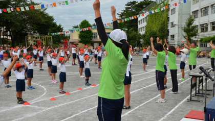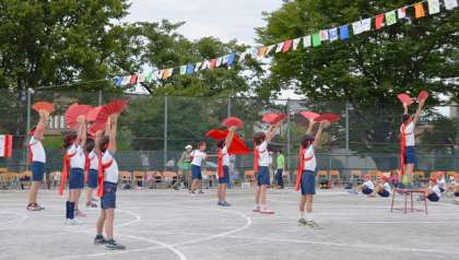 開会式の後は、ラジオ体操第一で準備運動です。運動委員と教員が前で体操します。今年は職員がライトグリーンのポロシャツを揃えました。体操の後は赤白応援団によるエールの交換です。応援団が練習の成果を大いに発揮し、すばらしい応援でした。