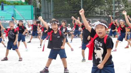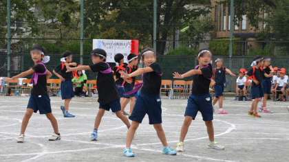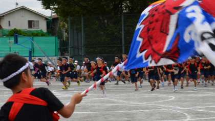 表現種目トップバッターは1・2年生。「キッズソーラン」です。黒のTシャツに豆絞りのはちまき、たすきをつけて力強いおどりを披露しました。大漁旗もかっこいいですね。