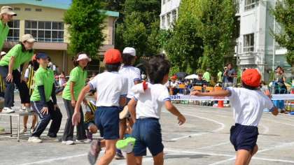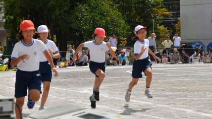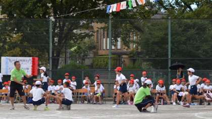 5年生の100m走です。高学年らしい力強い走りです。ゴール前の接戦にもつれ込む組も多く、みんなが全力で走っています。今年から審判は、階段状になってゴールを見て、正確な順位の判定に努めました。