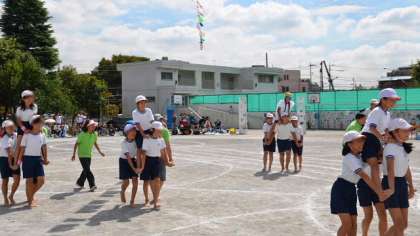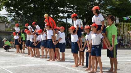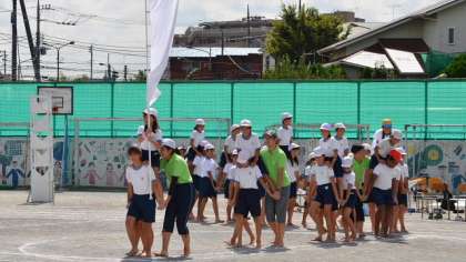 5・6年騎馬戦です。騎馬を組んで堂々たる入場。教員も応援で加わりました。1回戦は団体戦。騎馬が入り乱れて戦います。帽子を取った数で勝敗が決まります。1回戦は白の圧勝!
