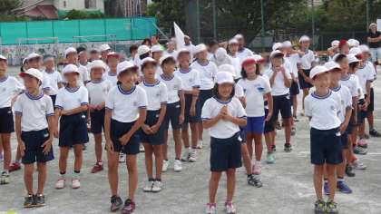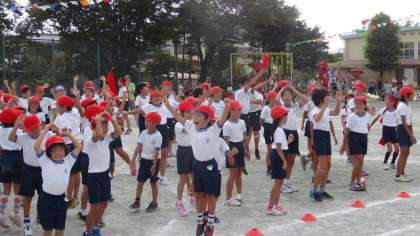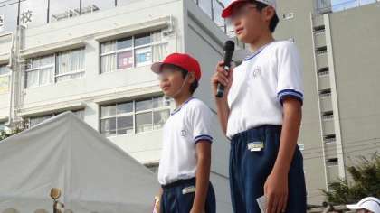 得点発表。児童の得点係が百の位と一の位、そして十の位と順番に読み上げます。固唾をのんで得点板を見上げる子どもたち。結果は・・・赤469点、白449点で今年も赤の優勝となりました。よろこぶ赤組です。