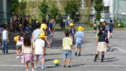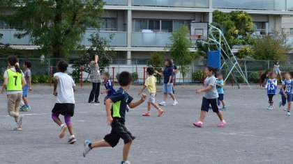 雨上がりの校庭。4日の中休みは、1年生から6年生で編成する希望っ子班みんなで一緒に遊びました。先日の希望っ子班給食の時に相談して決めた、ドッジボールや鬼ごっこをしました。