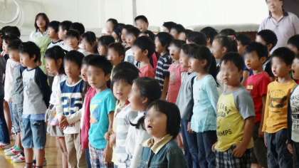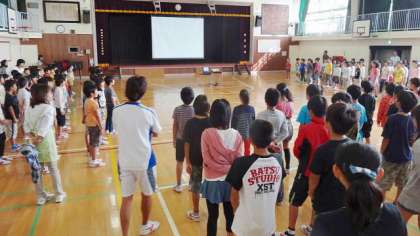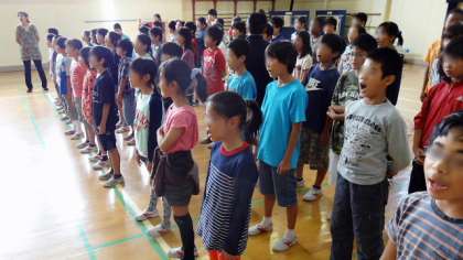 12日(金)朝、体育館で音楽朝会を行いました。みんなで歌う曲は「大きな歌」。「大きなうただよ〜大きなうただよ」というようにグループに分かれてかけあいで歌っていきます。お互いのグループが声を聞き合いながら元気な声で歌いました。