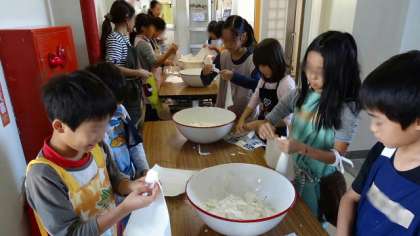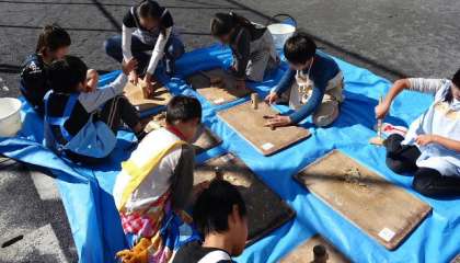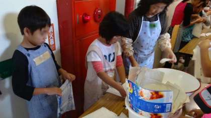 続いて、牛乳パックの表面のラミネートフィルムはがしと、和紙の原料の「こうぞ」の繊維をたたく作業を体験しました。どちらも紙作りには欠かせない大事な作業です。みんな集中して作業できていました。