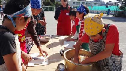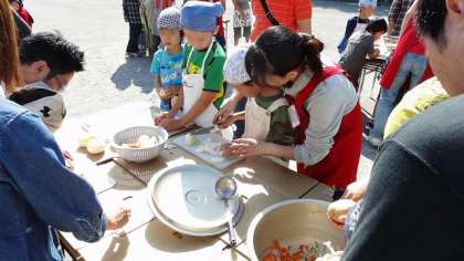 この会は多くの皆さんの協力で成り立っています。校庭にブロックで薪を焚くかまどをセットしたり、調理の下準備をしたりとスタッフの皆さんは大忙し。おかげで、子どもたちがカレー作りを楽しく安全に行うことができます。包丁をあまり使ったことのない子どもたちにていねいに教えるスタッフの皆さんです。