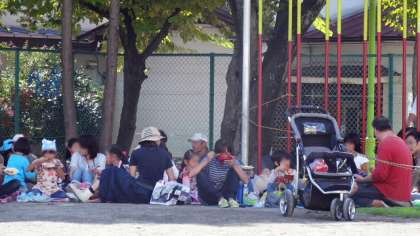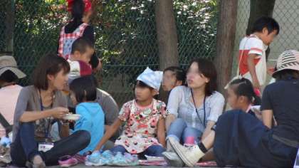 日差しが強いので、皆さん日陰で食事です。スタッフの皆さんは、それぞれの鍋のカレーを試食。どれもおいしい!でも、作り方は同じでも、微妙に味が違うのはなぜでしょうか。