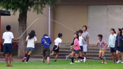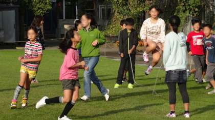 朝にみんなの激励をうけた6年生。朝も中休みも昼休みも放課後も、連合運動会の長なわとびの練習をしていました。がんばれ6年生。
