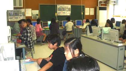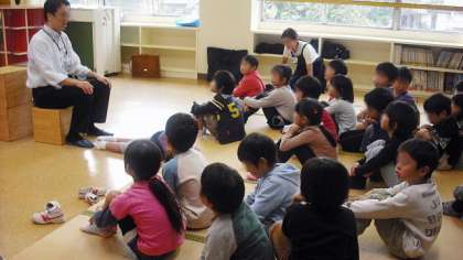 学校公開、授業のようすです。上は5年生の理科。パソコンを使った調べ学習です。下は、桜ヶ丘図書館の皆さんによるお話会のようすです。各学年様々な取り組みや授業の形態を取り入れて工夫しています。