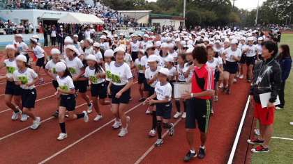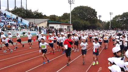 模範試技の後は、みんなで競技場のトラックを一緒に走る体験をしました。思っていたより一周400mは長く感じたようでしたが、思い思いのスピードで、楽しく走りました。