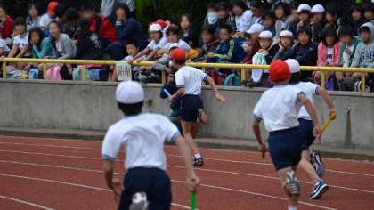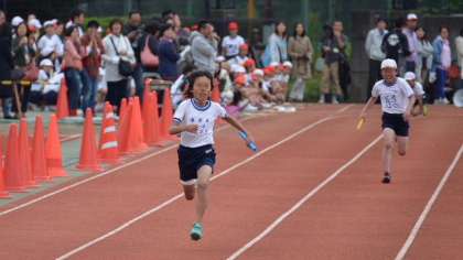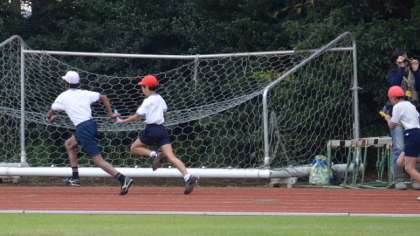 午前の部の最後は、男子と女子の選抜リレーです。今日参加した20人のうち男子4人、女子人、計8人がリレー選手という、まさに6年生の総力戦です。最初に男子。見事なバトンタッチで、快調な走りを見せてくれました。