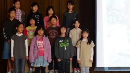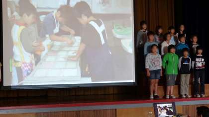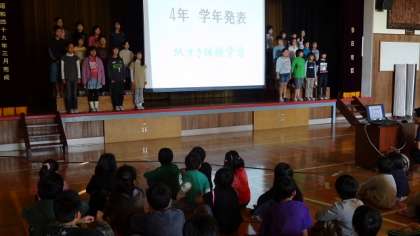 26日朝、体育館で4年生の発表集会を行いました。先日、山崎小学校伝統工芸室に出かけて行ってきた「紙すき体験」のことを発表しました。その時の写真を大スクリーンに映し出して、子どもたちが発表しました。希望っ子伝統の、メモを見ないで発表することが、しっかりできていました。