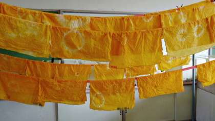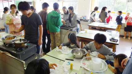 ターメリックパウダーを鍋の水にといてしばらく加熱し、ハンカチ(綿)をひたしてしばらく煮ます。ハンカチに色がついたら取り出して水洗いし、よく絞って乾かします。何がおもしろいのかというと、このハンカチにアルカリ性の水溶液(例えば石けん液)などをつけると赤く変色するのです。1年生から6年生まで参加していますので、保護者の方にも手伝ってもらって実験しました。
