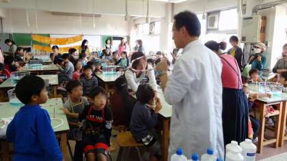 委員さんに用意しておいてもらった針金ハンガーを加工したリングに、毛糸を巻き付けます。けっこう根気のいる作業ですが、一生懸命頑張りました。できあがったら、小さなシャボン玉用にストローも加工してできあがりです。