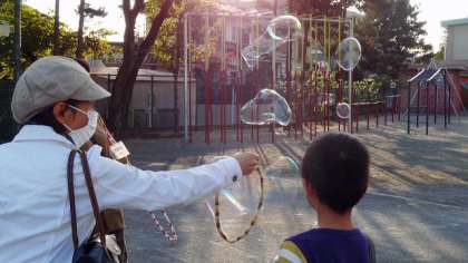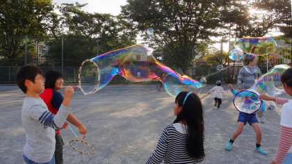 さっそく校庭でシャボン玉を飛ばしてみることにしました。傾いてきた太陽に照らされて、大きく膨らんだシャボン玉が七色に輝き、歓声があがりました。なかにはよくふくらまないグループもありましたが、材料を調整して、最後にはほとんどのグループで大きなシャボン玉ができました。