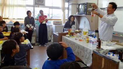 材料の配合のレシピを印刷して配りましたので、家でもチャレンジしてみてもらえるとうれしいですね。夏休みの自由研究などもにいかがでしょう。最後に家庭科室にもどり、色の変わるお茶の実験を見せて実験教室は終了です。実験は準備や後片付けが大変ですが、委員の皆さんがとてもよく手伝って下さり本当に助かりました。ありがとうございました。楽しそうな子どもたちのようすを見ると、とてもうれしくなります。子どもたちの科学への興味を引き出すことができたら、そして親子で科学実験をしてみたいと思っていただけたら幸いです。校長:千葉