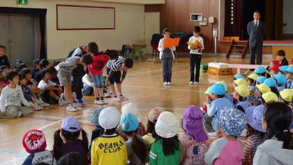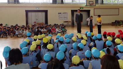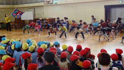 30日(火)10時30分から、1・2年生が近隣の幼稚園、保育園の園児を招いて行う恒例の「わくわくフェスティバル」を体育館で行いました。希望丘保育園、八幡山幼稚園、船橋西保育園、ひだまり保育園の、来年小学生になる年長さん111人が来校しました。歓迎のセレモニーでは、あいさつや運動会で踊った「キッズソーラン」を披露しました。