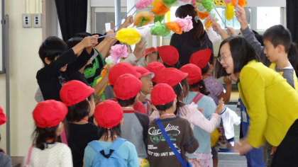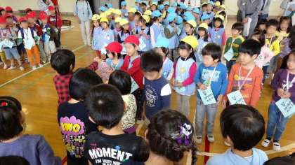 みんなで「さんぽ」を歌いました。最後に園児の代表に感想を聞き、1・2年生が作ったプレゼントを渡してわくわくフェスティバルは終了です。花のアーチで見送りました。今日来校した子どもたちの中には、来年度希望丘小学校に入学する予定の子もいます。1・2年生の子どもたちは、りっぱにお兄さんお姉さんぶりを発揮して、新入生をむかえる準備も万端です。