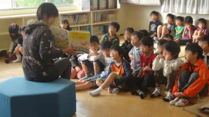 1年生のようすです。1年生の教室の隣には畳敷きの「絵本の部屋」があります。読み聞かせはいつもその部屋を使っています。保護者の方が絵本の読み聞かせをしてくださいました。目を輝かせながらお話の世界に引き込まれている子どもたちです。