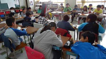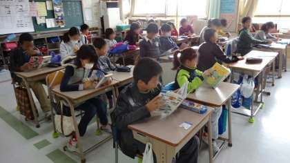 7日(水)、朝の読書タイム、高学年のようすです。5年2組は保護者の方による読み聞かせでした。読んでもらった後、感想を述べているところです。5年1組と6年は自分で選んだ本を静かに読んでいました。本好きの子になってほしいですね。