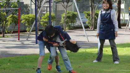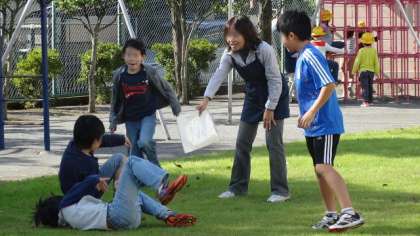 3年生が芝生の上で楽しそうに相撲をしていました。最近相撲をしている子どもの姿をあまり見たことがなかったので、うれしくなりました。担任の先生が行司役です。やわらかい芝生の上だからこそ、思いっきり転がれます。