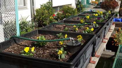 先日球根を植えた大型プランターに、パンジーの花を植えました。校舎南側に彩りを添えています。