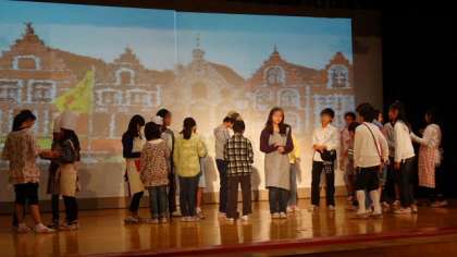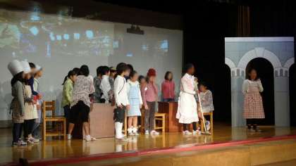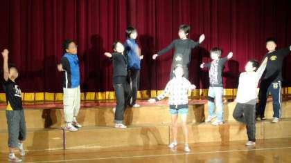 10日、5年生の劇の練習です。他の学年より人数の多い5年生。舞台の雰囲気も他の学年とひと味ちがいます。照明の担当も交代で行います。音楽に合わせたダンスもあり、本番が期待できそうです。