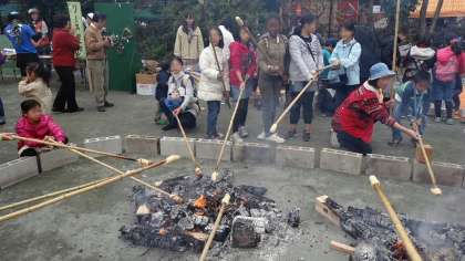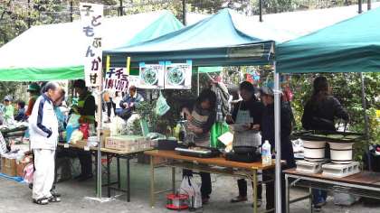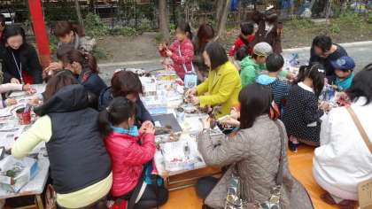 子どもたちだけではなく、PTAや関係団体のお店も出ました。「PTA」は食器の貸し出しのお店を出しました。子どもバザールはエコをキャッチフレーズにしているので、食べ物の容器は持参、または借りて自分で洗って返すのを原則としているのです。包み紙や竹串なども原則各自の持ち帰りです。「遊び場開放委員会」は竹筒の先にパン生地をまいて薪の火で焼くお店とリース作りのお店を出しました。「子どもぶんかむら」は焼きそばやチヂミなど鉄板焼きのお店を出店。「小径の会」は押し花を使ったしおりのお店を開きました。いずれもお客さんが大勢訪れて好評でした。午後からは子どもたちのステージもあり、楽しい秋の一大イベントです。