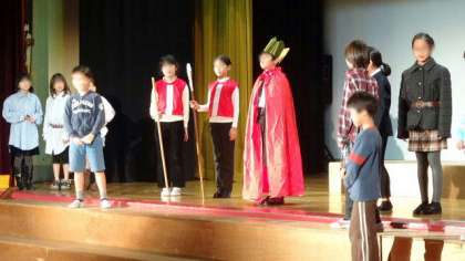 4年生の練習風景です。本格的なミュージカルに挑戦。覚えなければならない台詞や歌がたくさんあって大変です。がんばっていますが、台詞や演技で苦労しています。是非ご家庭でも見てやって下さい。