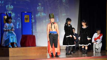 劇の最初は4年生。みなさんご存じの「はだかの王様」のお話を、歌をまじえて演じます。登場人物の名前にも注目ください。皆さんには王様の服が見えるでしょうか?
