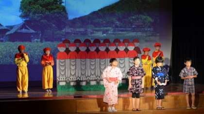 2番手は2年生。村はずれの十六地蔵に化けて、村人や通りがかりのおさむらいをだます悪いキツネ。そのうち「お化け地蔵」のうわさが・・・さて村人たちはどうするでしょうか? 元気な2年生がコミカルな演技に挑戦です。