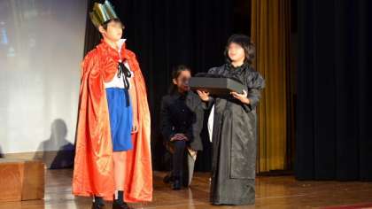 最初は4年生「はだかの王様」です。皆さんご存じのお話ですが、今回は劇団四季のミュージカルをもとにした脚本の小学校版です。登場人物の名前も服飾に関係した名前です。4年生は人数も少なく、しかも男子が6人ですので男役を女子が務めたり、二役で出たりしました。