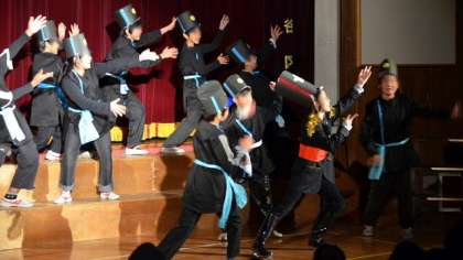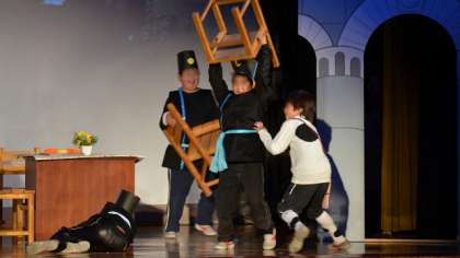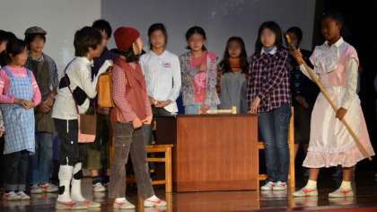 ミュージカルをもとにした台本なので、歌やダンスの場面もあります。子どもたちが考えた振り付けで、練習を重ねるたびに息もぴったりに演じることができました。ライオネルが兵隊から逃げ回る場面も、迫力とスピード感があり素晴らしいできでした。