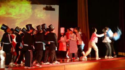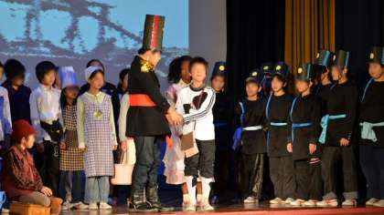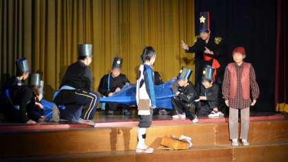 主人公は4人が、他にも2人が一つの役を演じたのですが、衣装や演技の工夫で、それほど違和感を感じることもなく見られたのが良かったですね。5年生は照明や大道具の出し入れも自分たちで行いました。火事の場面では照明係の子どもたちががんばりました。
