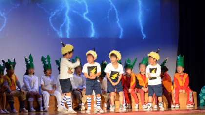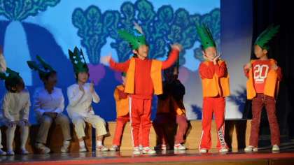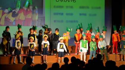 一難去ってまた一難。モグラの攻撃をカエルのおかげで逃れることができたと思ったら、今度は日照りで水不足。そこにやってきたのがカミナリたちです。おかげで雨がふって野菜たちはすくすくと育ちました。めでたしめでたし。最後は配役の紹介画面をバックに、みんなで元気な歌を披露してエンディングです。かわいい子どもたちの、すてきな舞台でした。