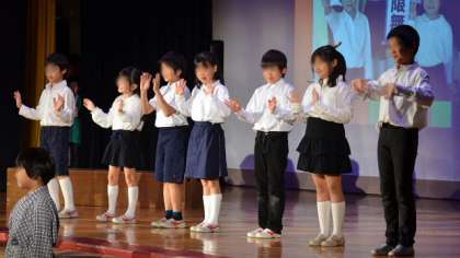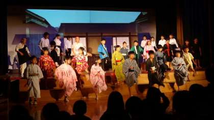 エンディングはみんなで寿限無の歌に合わせて踊ります。本当に楽しそうに演じていた子どもたち。3年生らしい元気で楽しい劇になりました。会場の皆さんをおおいに笑わせてくれました。