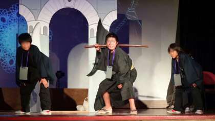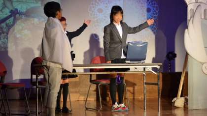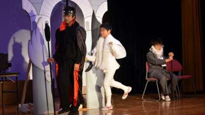 霊界空港で出会う個性的なキャラクターは、役になりきって子どもたちが熱演しました。会場がどっとわいたり、しんみりしたり、拍手が涌き起こったりと会場と一体となって劇が進みます。