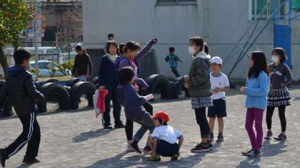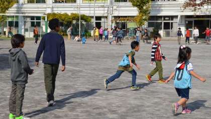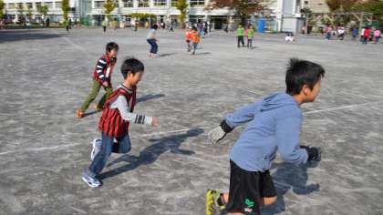 1年生から6年生までが一緒に遊ぶので、高学年は低学年にあわせてじょうずに遊んでいます。高学年にとっては物足りないこともあると思いますが、小さい子から、お兄さんお姉さんのように慕われているのを見ると、まんざらでもないようすで楽しそうに遊んでいますね。