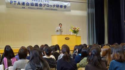 26日(月)10時から、船橋小学校で4ブロックのPTA研修会が開催されました。本校からもたくさんの保護者の皆様が参加しました。会場全体では400名の参加がありました。それぞれの学校で行っているPTA研修の成果をもちより展示し、活動の交流をはかりました。本校は「輪〜時代によって変わる子育てについて」をテーマに、アンケートの結果や、先日行われたグループディスカッションから、今も昔もコミュニケーションが大切であるという成果を発表しました。講演会では、親野智可等さんの、わかりやすい子育てについてのお話を聞き、有意義な会となりました。本校の研修会を企画運営し、今回の報告をまとめてくださったPTA研修委員会の皆さんに感謝いたします。