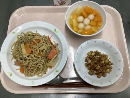 献立 塩焼きそば 大豆とじゃこの甘辛あげ フルーツ白玉 牛乳