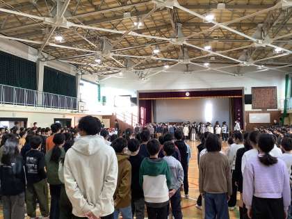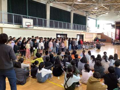今月の歌は「もみじ」です。始めに4年生の歌をみんなで聞きました。最後に全校のみんなで歌うと、秋の情景が浮かぶすてきな歌声が体育館中に広がりました。