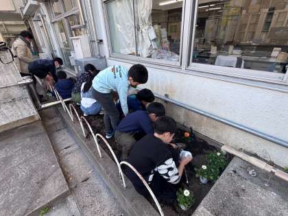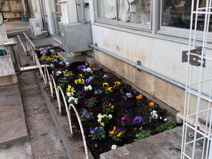 ビオラ、小輪パンジー、パンジー、ノースポールの4種類を職員室前の花壇に植えました。この花も世田谷産(せたがやそだち)です。植え方や水やりのタイミング等たくさんのアドバイスをいただきました。ご来校の際はご覧ください。