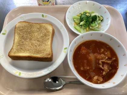 献立 セサミトースト ポークビーンズ グリーンサラダ 牛乳