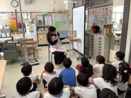 絵本「おしえて!くもくん」を読みながら、体には大切なプライベートゾーンがあることやプライベートゾーンは見たり見せたりしないこと、嫌なことをされたら「いや」と伝えたり相談したりすることなどを学びました。みんな、真剣な表情で聞いていました。自分の体も友達の体も大切に生活していきます。