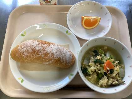 献立 あげパン(シュガー) 卵雑煮 くだもの(はれひめ) 牛乳