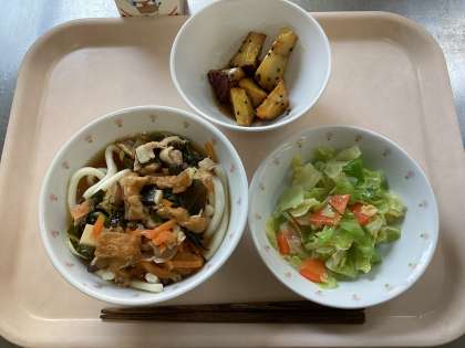 献立 わかめうどん 塩だれキャベツのサラダ 大学いも 牛乳