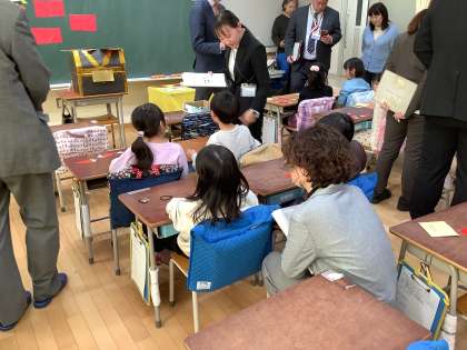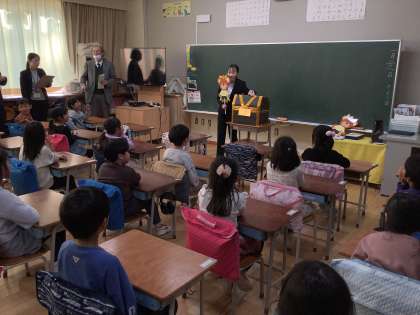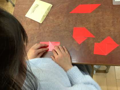 今日は、同じ大きさの直角二等辺三角形の色板4枚を使ってできる形を考えました。基本の形から4枚のうち1枚だけを動かしてできる形を考えました。回す、ひっくり返す、ずらすと、色々な形ができる楽しさを味わいました。友達に自分の作った形を上手に話すこともできました。