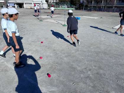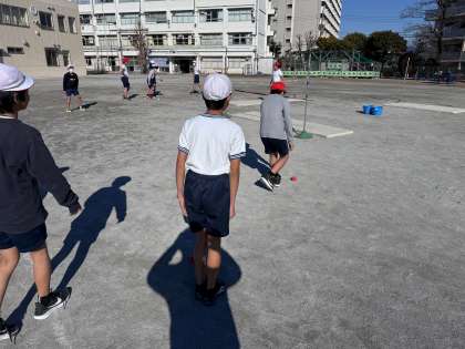 校庭での体育の学習は、走り高跳びに取り組んでいます。