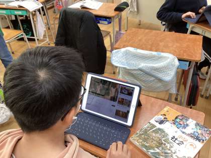 戦争が激化し、日本各地への空襲が始まったことによる被害の大きさについて教科書や資料集、動画を見て調べています。日本本土への空襲が始まったのはサイパン島を占領したことで行われるようになったことや、空襲が激しくなると当時の政府が子どもたちの生命を守るために、学童疎開をしたこと等が分かりました。サイパン島の場所や東京から疎開した場所を地図で確認したり、当時の映像を見たりするなど、多くの資料を活用して当時の様子を実感できるように指導しています。
