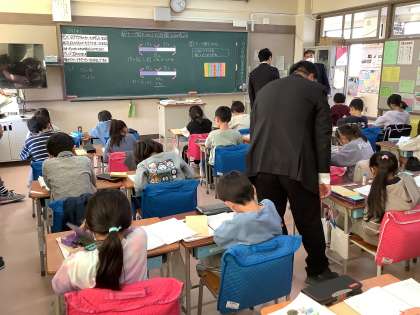 今日の算数の学習では、問題を読んで式を立てる学習をしました。問題文を読んだときには、たし算になるのか、ひき算なるのか意見が分かれました。テープ図を使って問題場面を表して、友達と自分の考えを話し合いました。テープ図を使うと分かりやすくなると感じた様子でした。